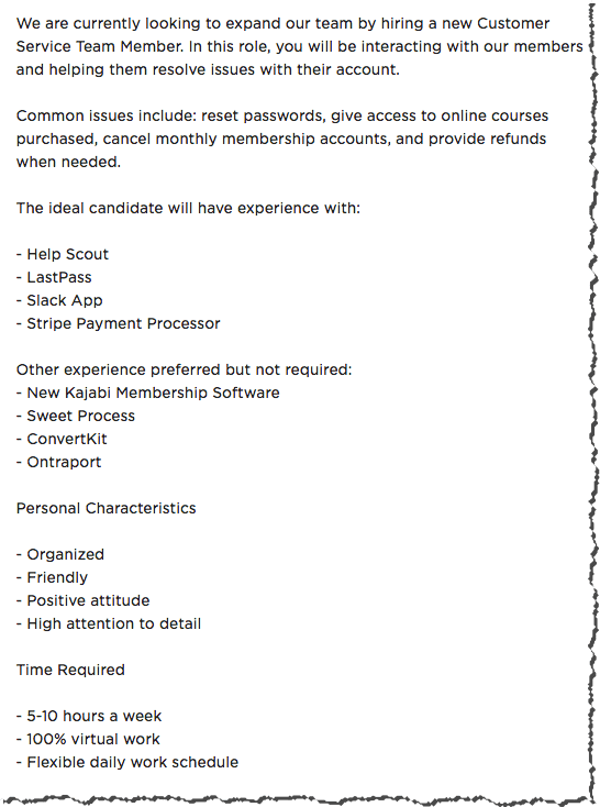 - Preferred experience – List any other programs you use to run your business that would be helpful (but not required) for the candidate to know. Maybe you love for them to have experience with Kajabi or ConvertKit.